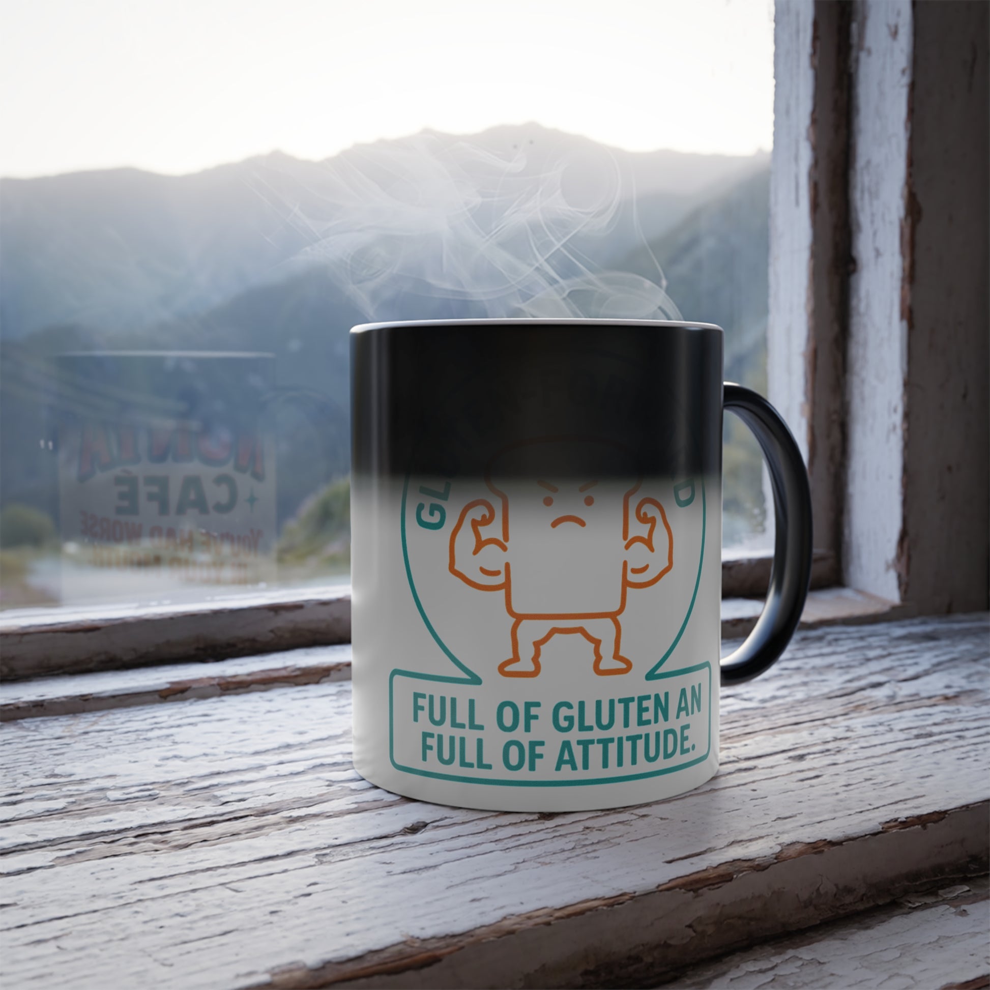 This 11oz color-changing mug is what happens when science meets sass. Cold? It’s mysterious. Hot? BAM — you’re face-to-face with a flexing loaf and a glowing Nunya Café logo, ready to fuel your day with a steaming cup of shut the hell up, it’s too early.